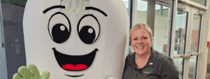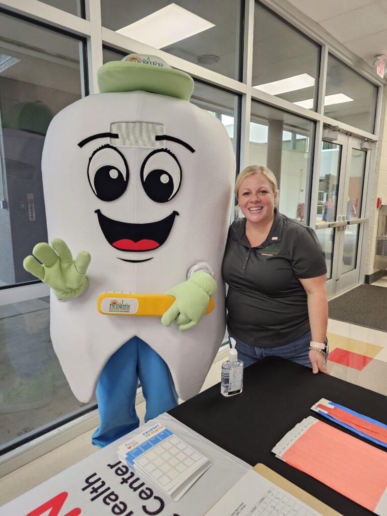 Maple takes a picture with Dr. Flossy, Premier’s Pediatric Dental Mascot, last year at the Back to School Health and Wellness event at Hudson Academy.